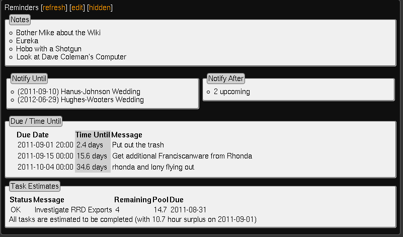 Investigating this, I found that it was useful, but somewhat limited. At the same time I wanted this type of date calculation, I also wanted simpler reminders for things outside of my hourly pool, or just simple notes that I could reference. I also wanted to record items to be notified of at a later date, or ones that would auto-cancel after a certain time period.