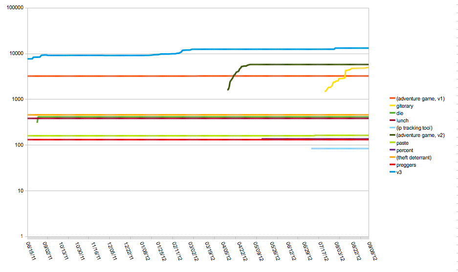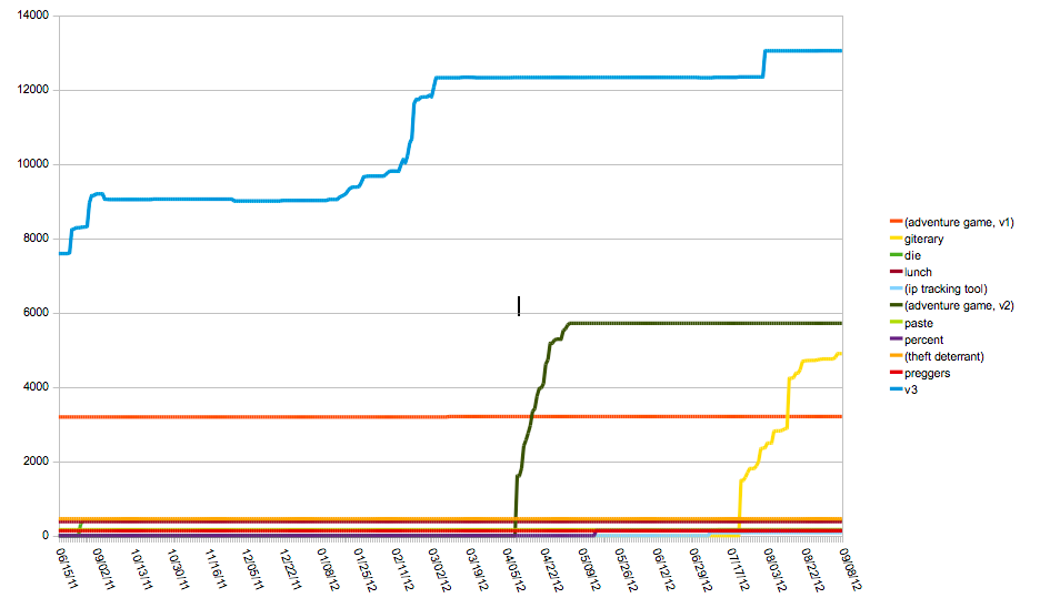 That said, as it is, I have almost 30,000 lines of code I'm developing against or maintaining over the last few years. v3, going from ~7000 to ~12000 lines of code has probably seen the most work, while some of my other projects (some I've exposed, some I have not) come in close second. My adventure game framework attempts share maybe 50% of the same codebase, but vary wildly after that. My collaborative, distributed wiki/novel-writing system consists of almost entirely new code, using only a few utility methods from some of my other projects.